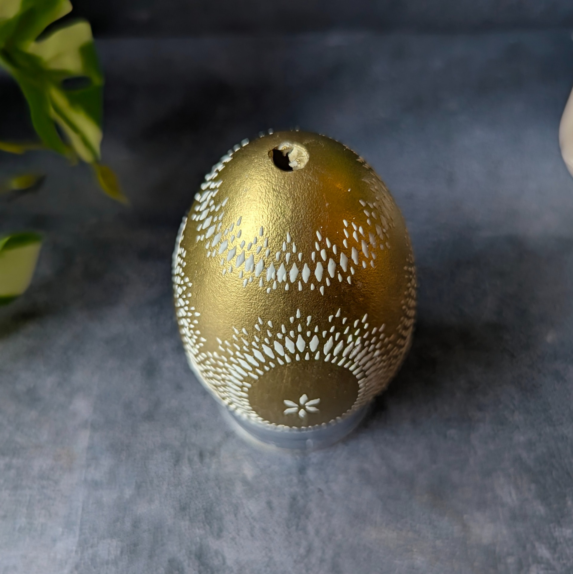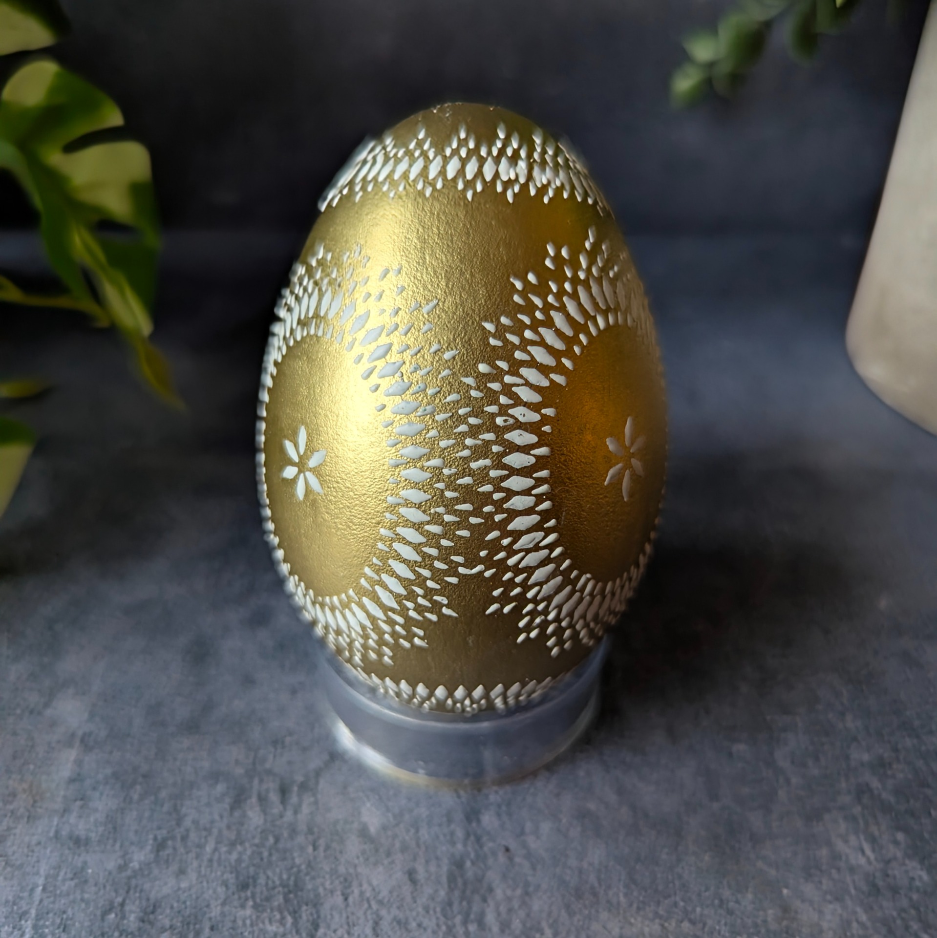 Gänseei (Echtei) lackiert in Gold mit einem weißen Wachsmuster.