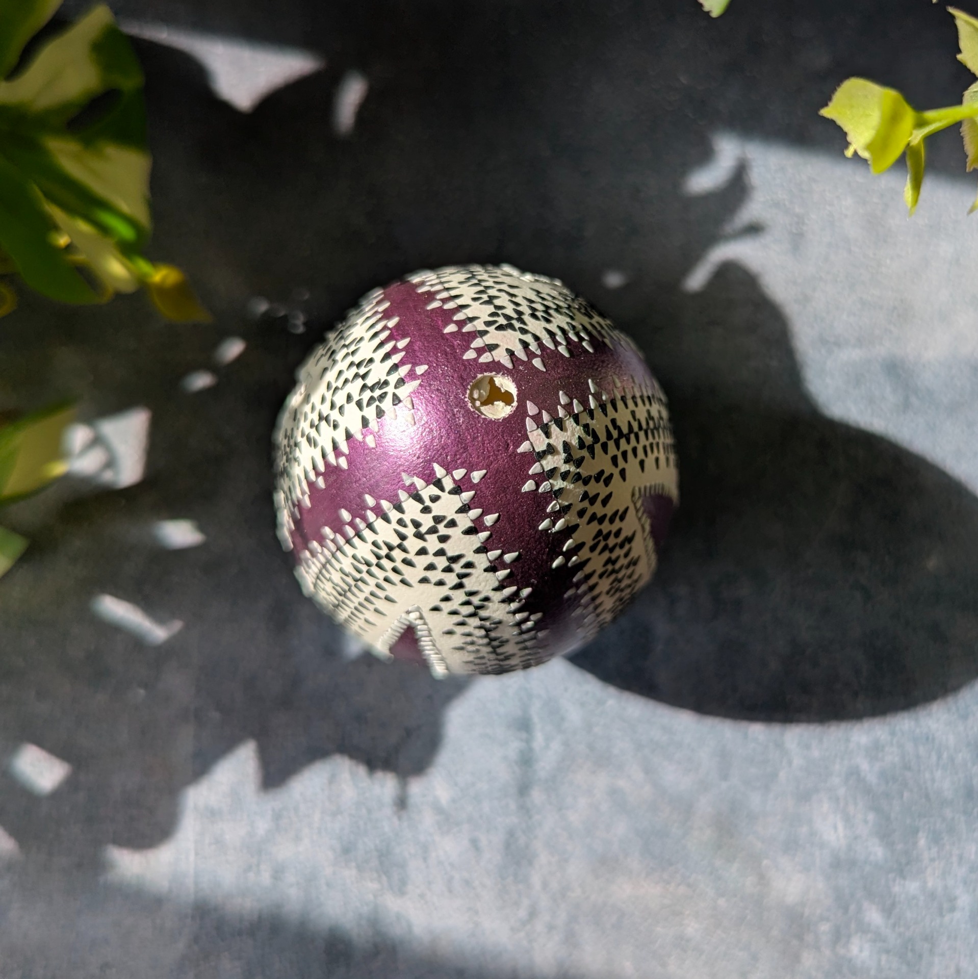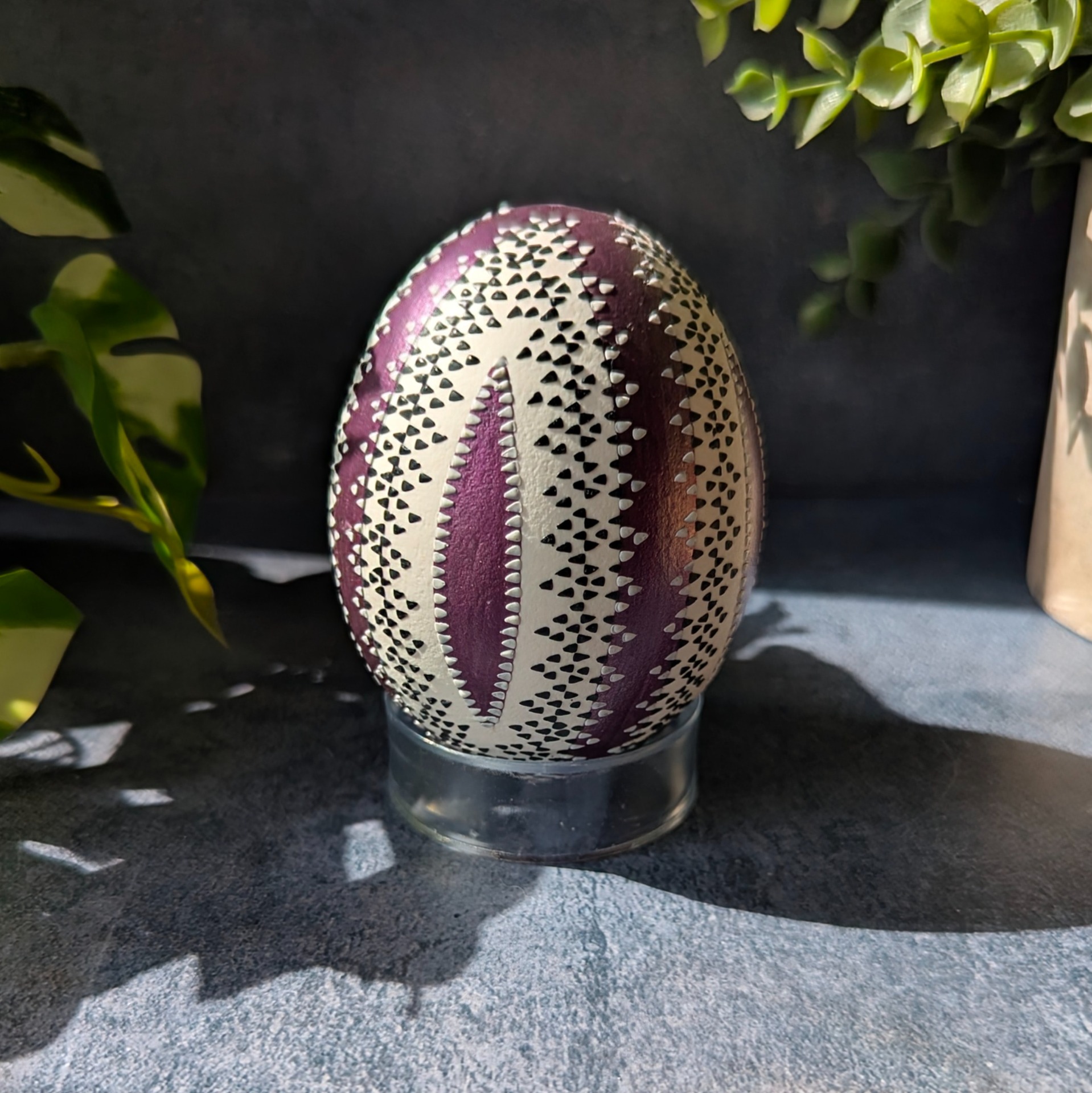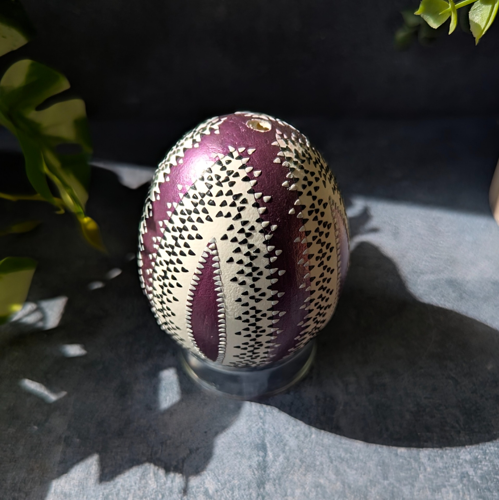 Gänseei (Echtei) teilweise lackiert in Lila mit einem weißen und schwarzen Wachsmuster.