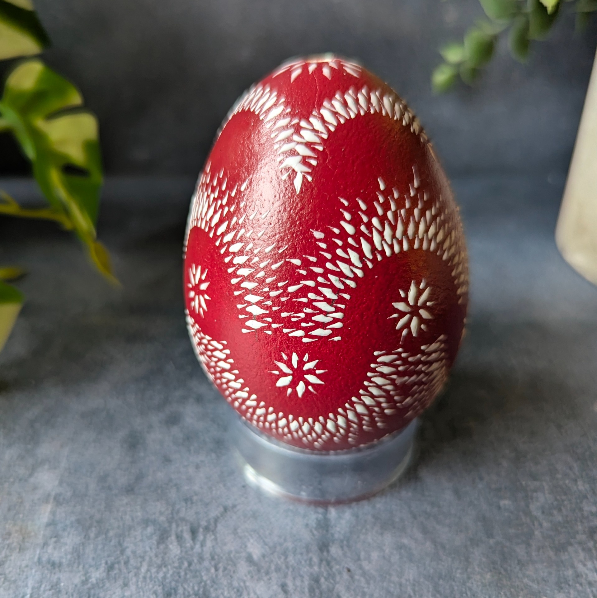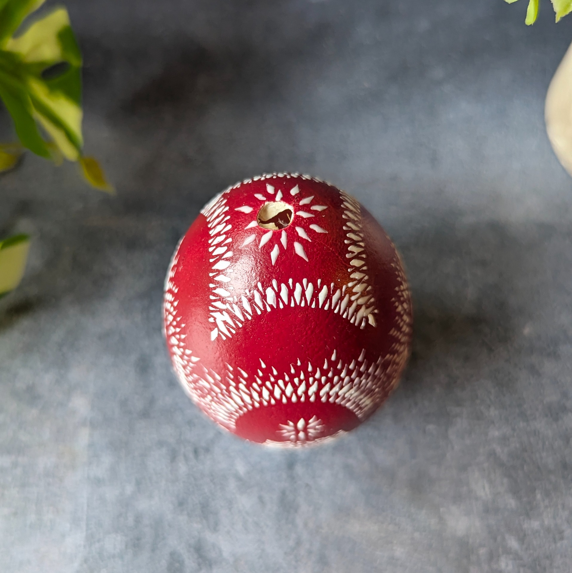 Gänseei (Echtei) lackiert in einem dunklen Rot mit einem weißen Wachsmuster.