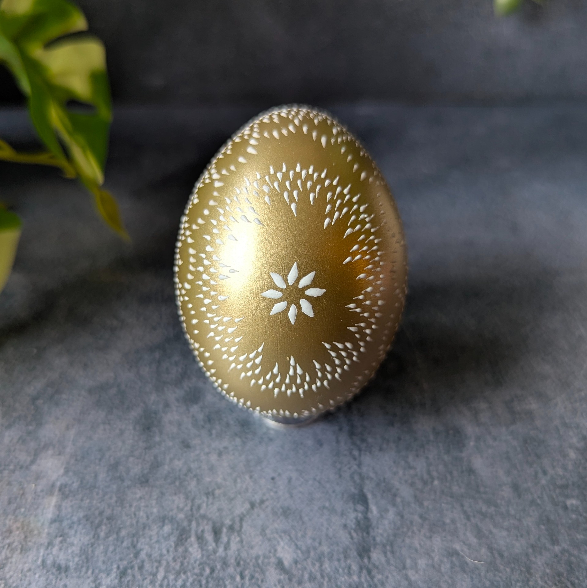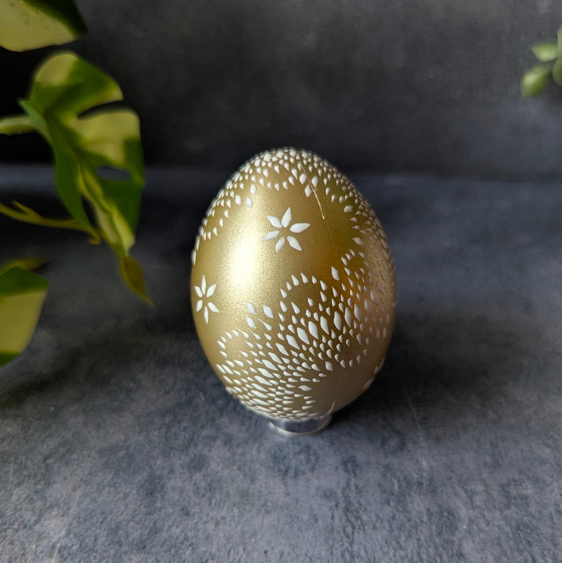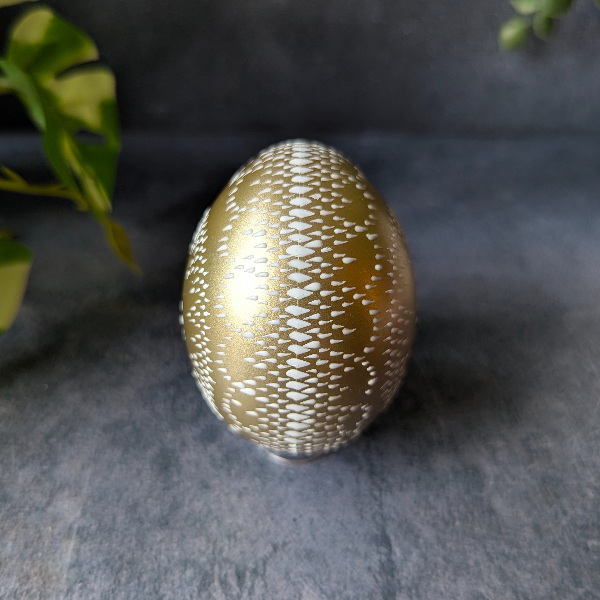 Kunststoff Hühnerei in Champagner-Gold mit einem Wachsmuster (Bossiertechnik) in Weiß.