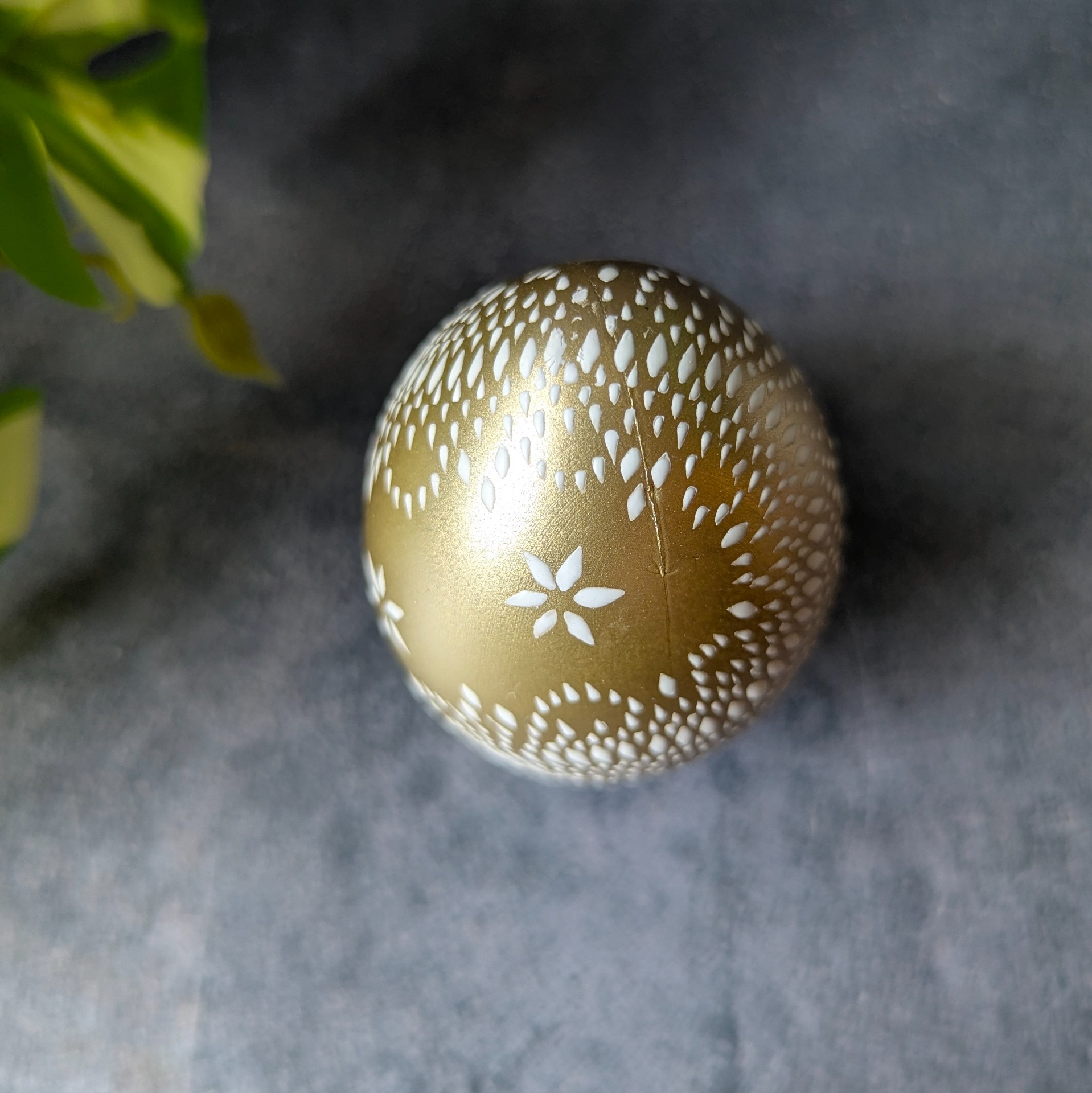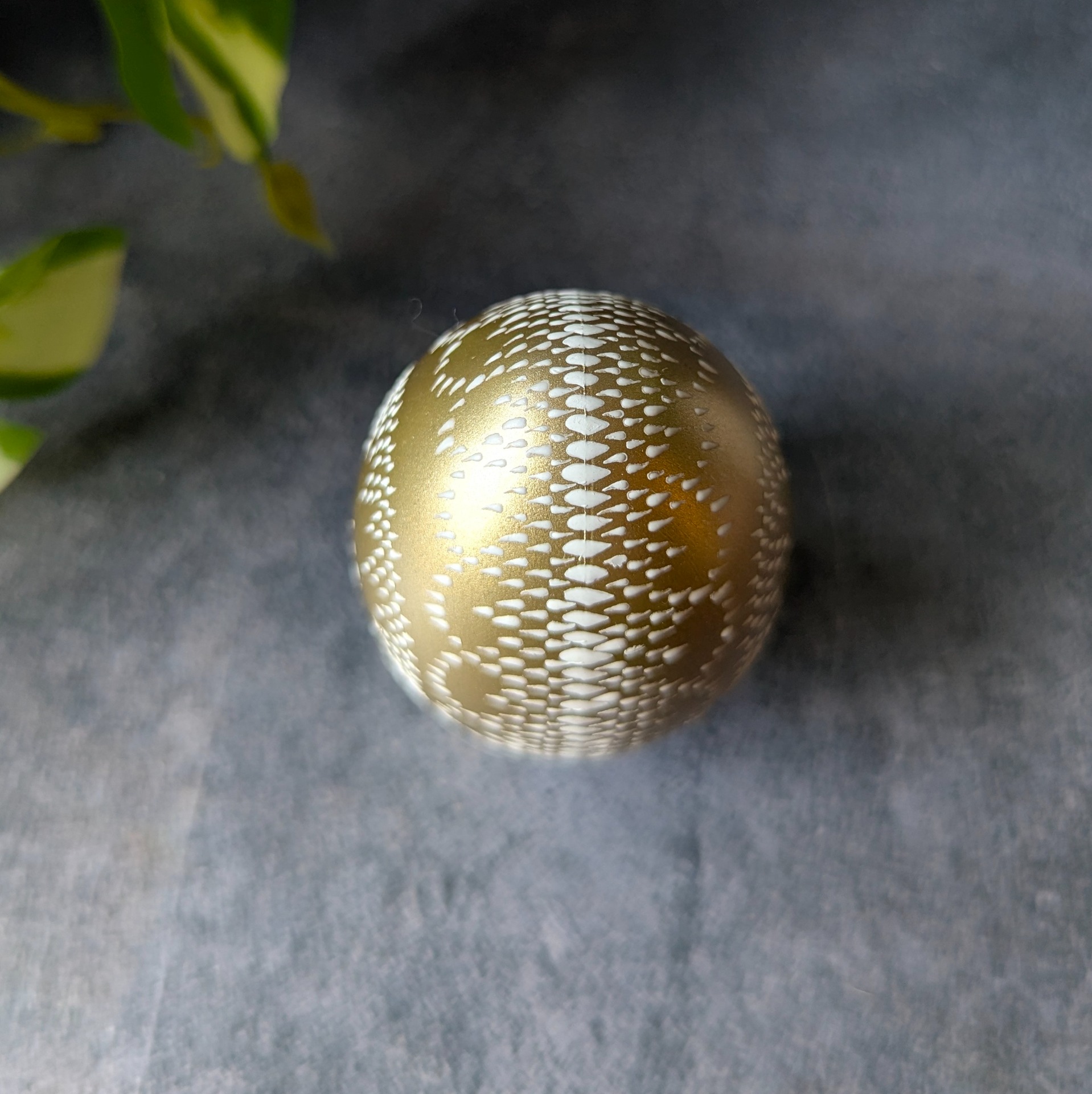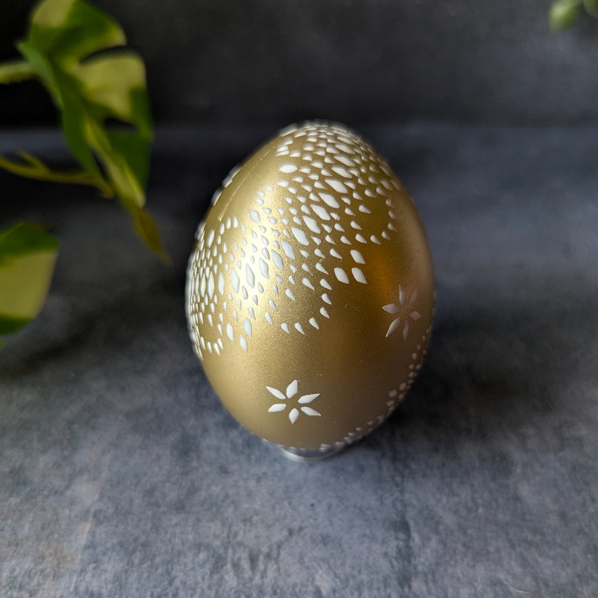Kunststoff Hühnerei in Champagner-Gold mit einem Wachsmuster (Bossiertechnik) in Weiß.