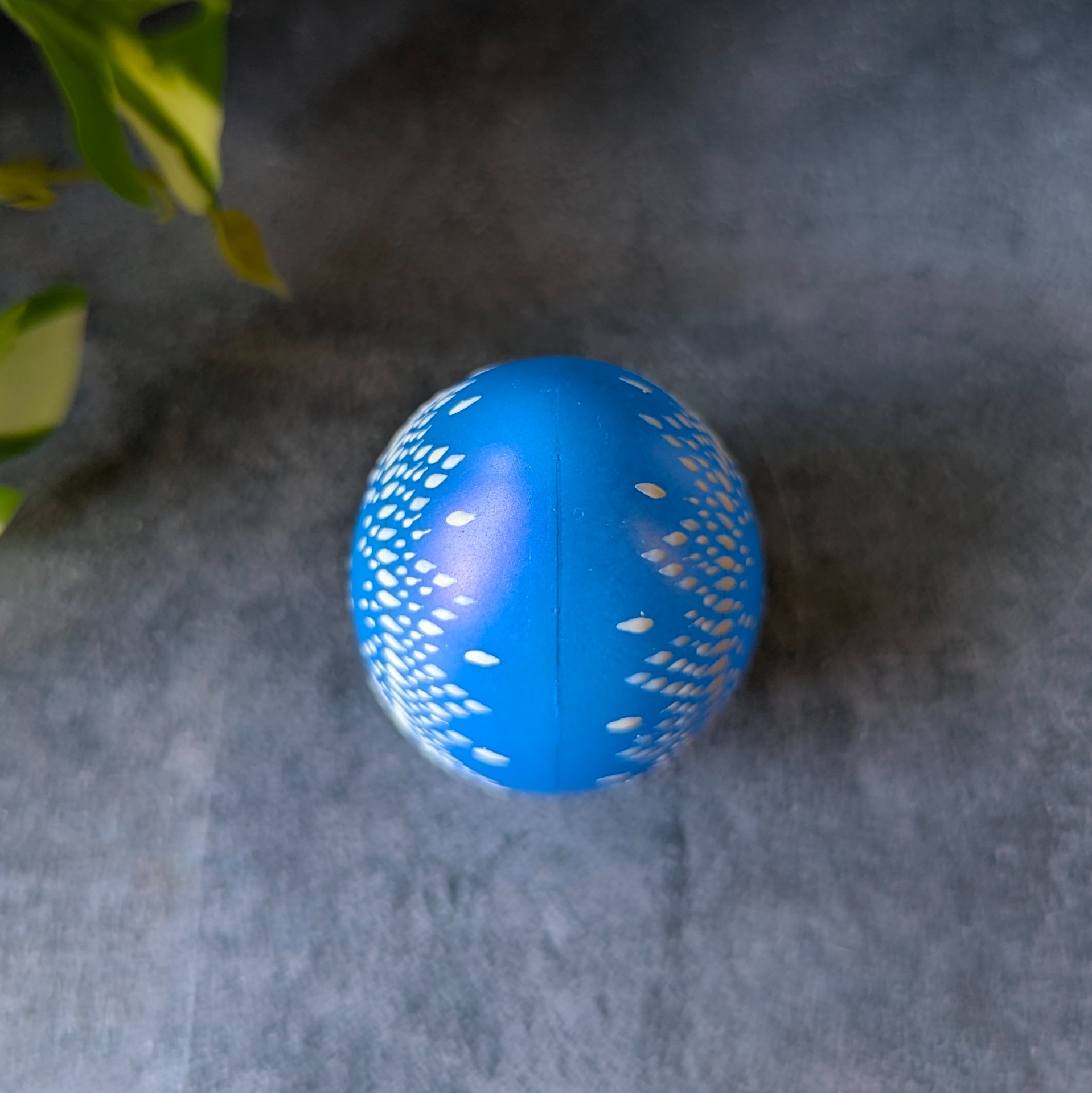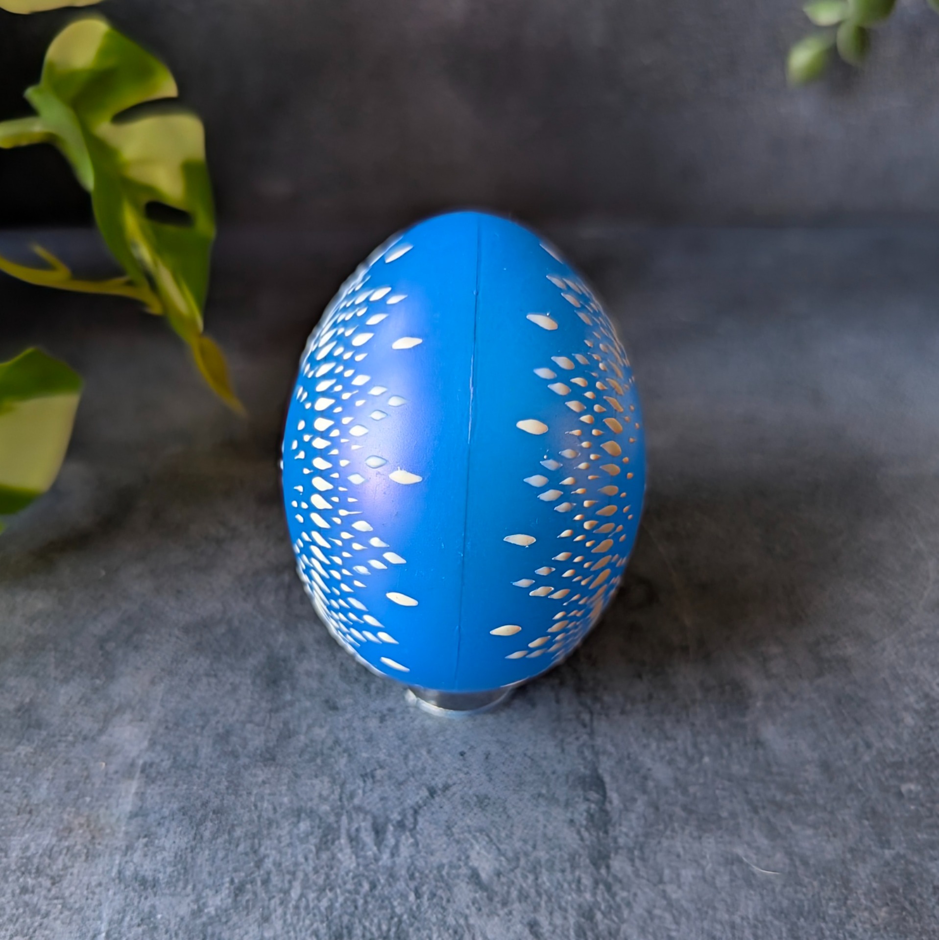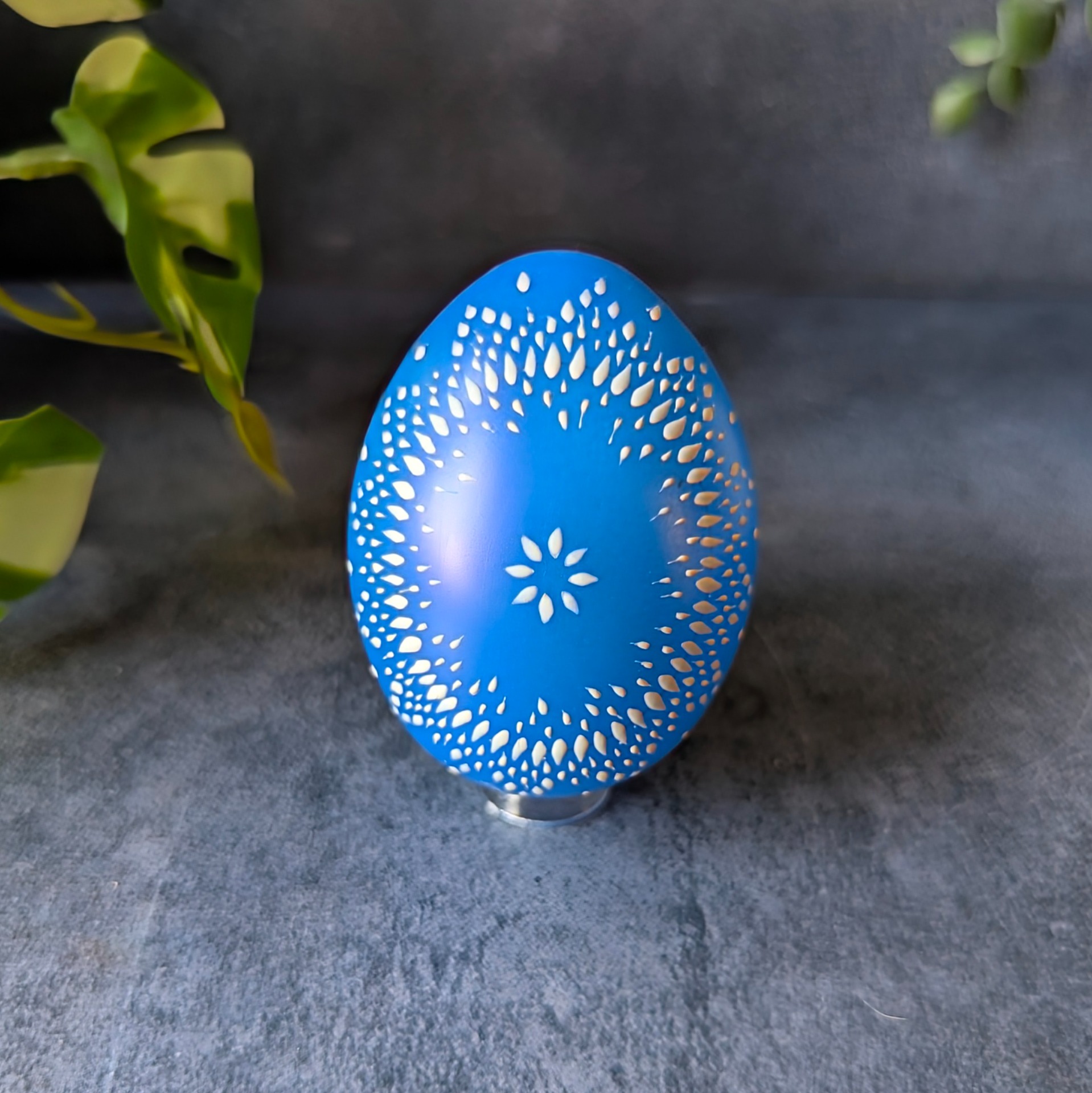 Kunststoff Hühnerei in Candy-Blau mit einem Wachsmuster (Bossiertechnik) in Weiß.