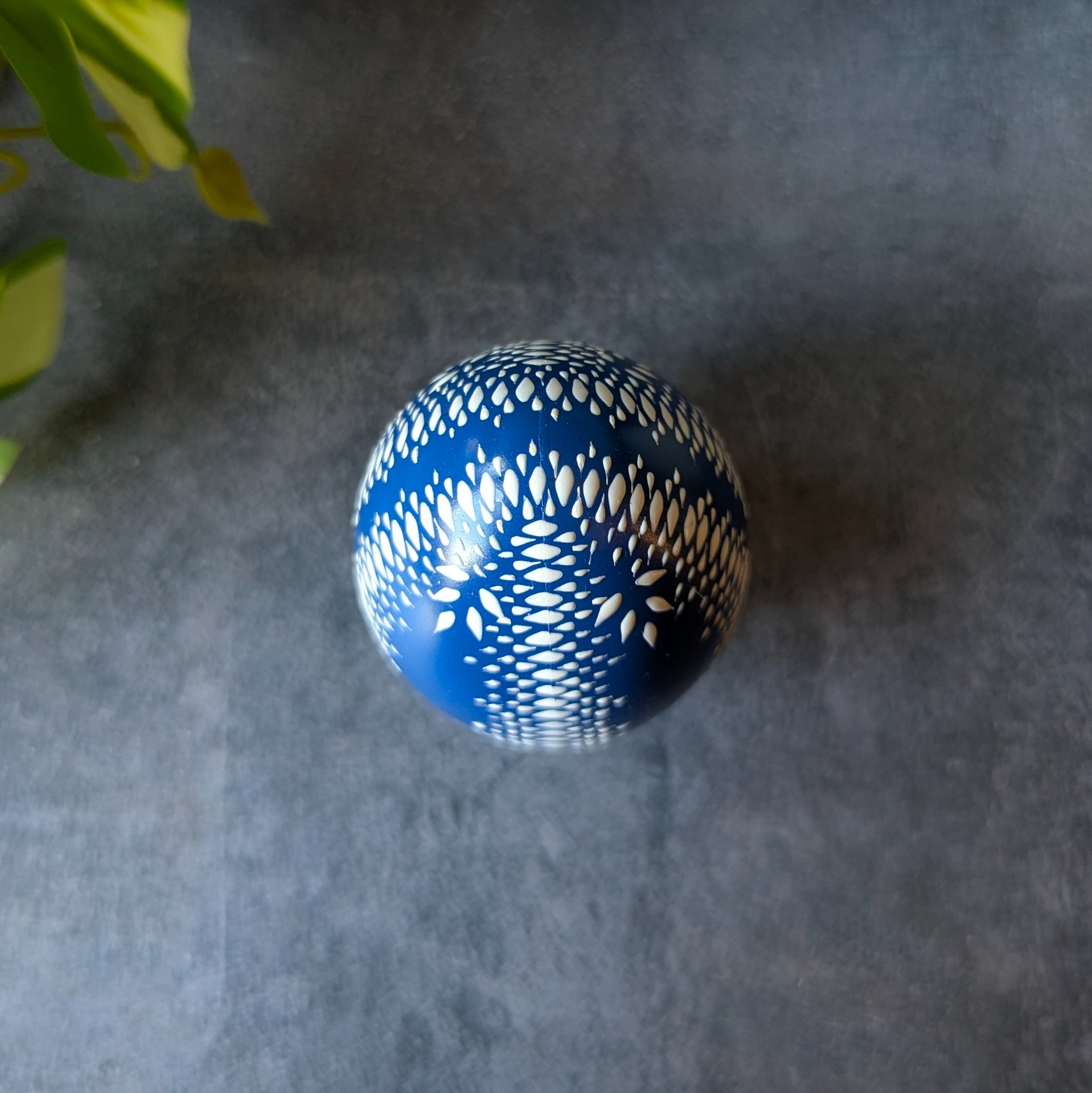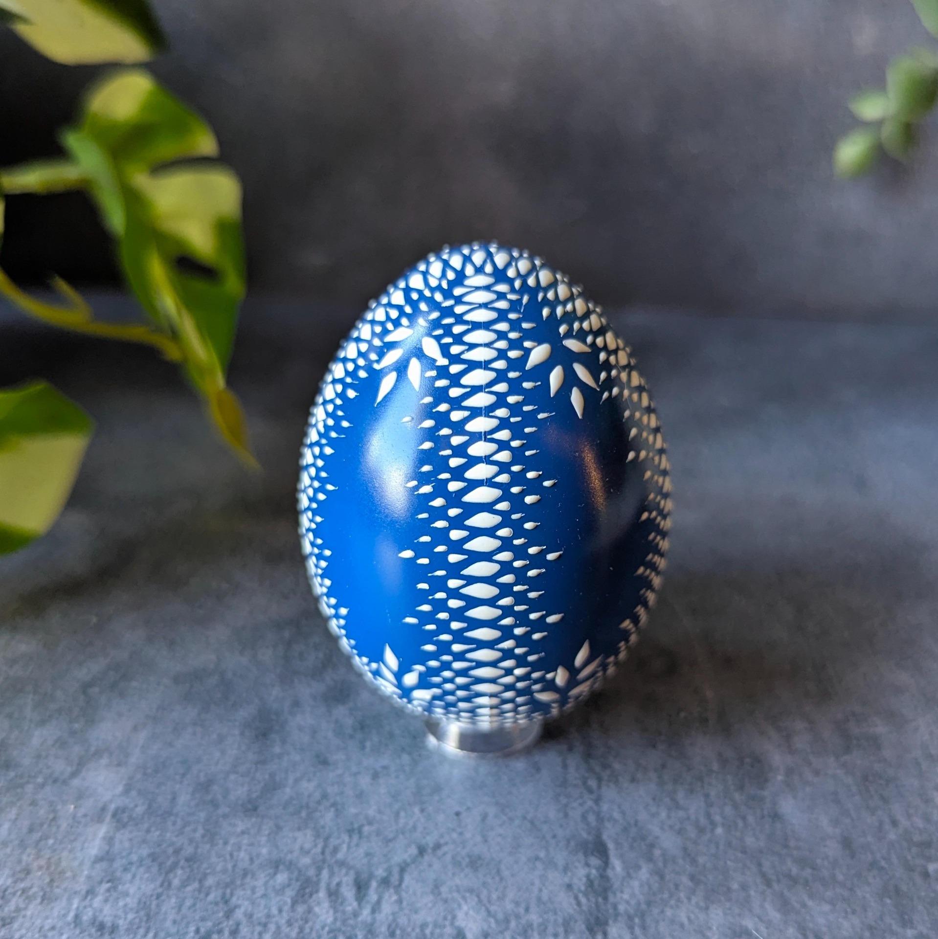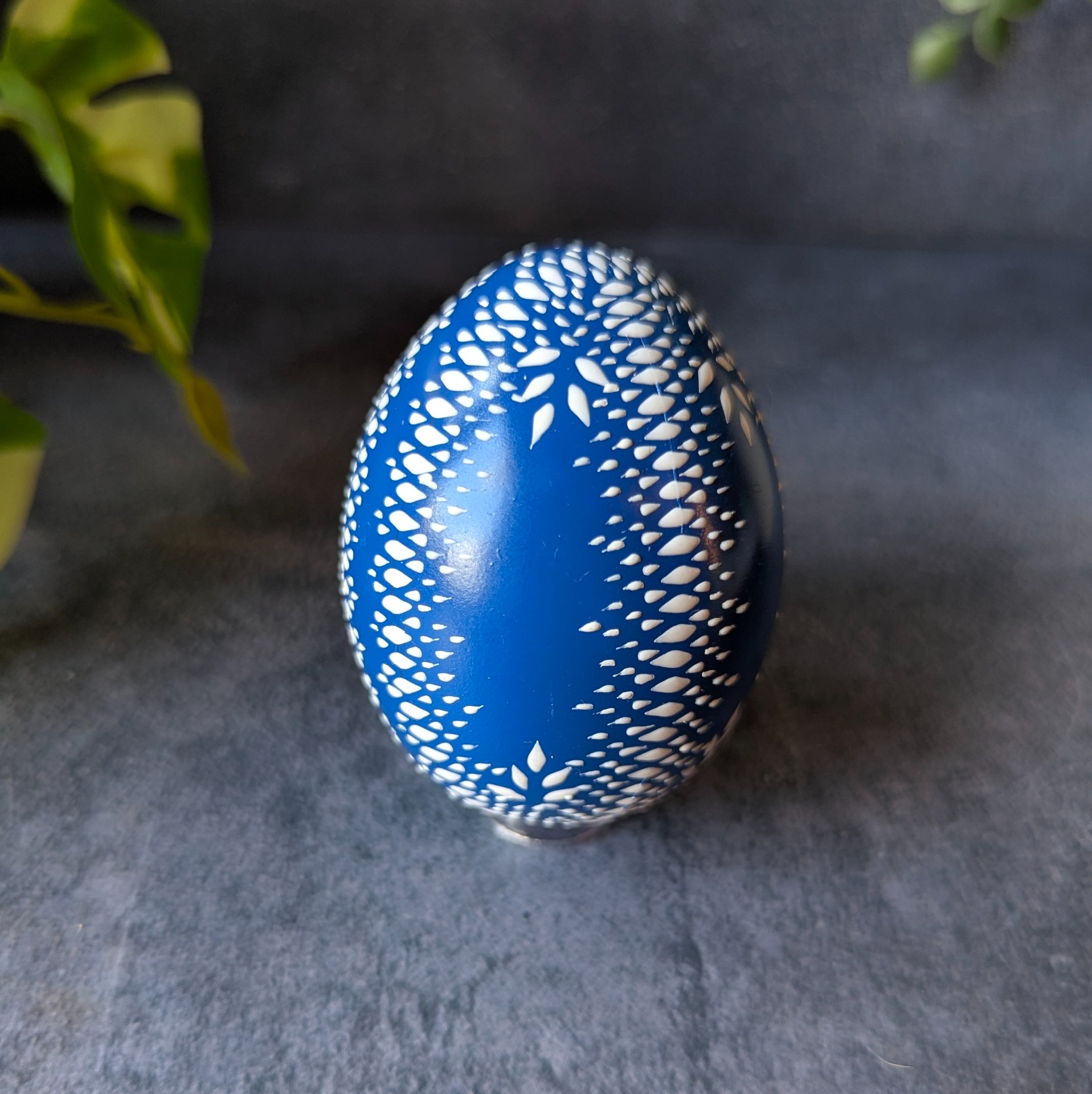 Kunststoff Hühnerei in Blau mit einem Wachsmuster (Bossiertechnik) in Weiß.